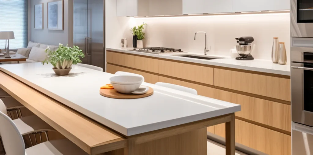 Counters, sink & fixtures, stovetop wipe, exterior of appliances, microwave exterior, cabinet fronts spot-clean, trash out, floors vacuum/mop.